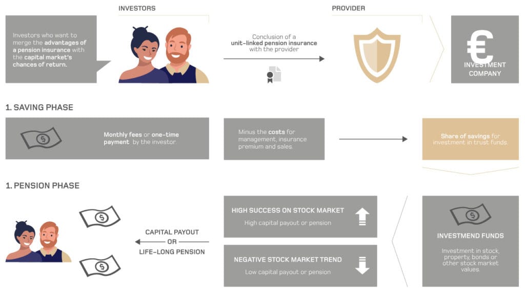 You can cancel the contract at any time. If you do, the money saved in your account will be paid out to you. It is not a good idea to cancel the contract during the first few years. This is because the costs charged during the early years would reduce the amount of money you get back. You can also add an occupational disability insurance to your pension plan. This insurance helps if you cannot work due to illness or injury. If the person paying into the pension dies, the saved money will be paid to the person they named as beneficiary. If the person receiving the pension dies during the payment phase, the money will be paid to the named beneficiary for the agreed period of time. This is called the guarantee period (Garantiezeit). The guaranteed payout period can last between 5 and 18 years. However, this slightly reduces the amount of pension you can receive each month. If the policyholder leaves Germany, the policy can either continue or be set to stop receiving contributions. The remaining balance will still be active for the policyholder because the investment in the funds will continue. You will receive the lump sum payment or retirement pension whether you live in Germany or another country.