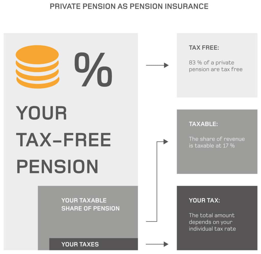 You can start receiving your pension payments right away or choose to start at a later time. Most of these pension plans invest your money in funds (groups of investments). These pension plans offer many types of funds to choose from, including ETFs (Exchange-Traded Funds) and actively managed portfolios (where experts pick the investments). The benefit of insurance pension plans is that you can change your investment funds at least 12 times a year without paying any fees or taxes on the profits. If you feel that investing in financial markets is too risky, some insurance companies offer a traditional plan with a guaranteed interest rate. Right now, this rate is 0.9% per year. Additionally, because insurance companies invest your money, they share some extra profits with you. This is called Überschusse (profit participation). Right now, the total return is at least 2.25% per year, but this can be a little different depending on the company. You can borrow money using your Private Rente as security. However, this borrowed money can be taken away and counted when calculating your unemployment benefits. At the end of the saving phase, you can choose to get your money as a lump sum, a lifelong pension, or a combination of both. If the contract lasts at least 12 years and you withdraw the money at the earliest age of 62, there are two different ways the money can be taxed. If you choose to take the money as a lump sum, you will pay tax on 50% of the profits at your personal tax rate. If you choose a lifelong pension, only the profit part of the payments (called Ertragsanteil) is taxed. The Ertragsanteil is a fixed percentage that depends on the age when you start receiving the pension. For example, at age 62 it is 21%, at 63 it is 20%, at 64 it is 19%, at 65 to 66 it is 18%, and at 67 it is 17%. If you start receiving a pension of €1,000 at age 65, you will only pay tax on €180 of that amount, using your personal tax rate. If the conditions mentioned above are not met, the full amount will be taxed with the withholding tax called Abgeltungssteuer. This tax rate is currently 25%. The pension payments are guaranteed for the whole life of the person receiving them.